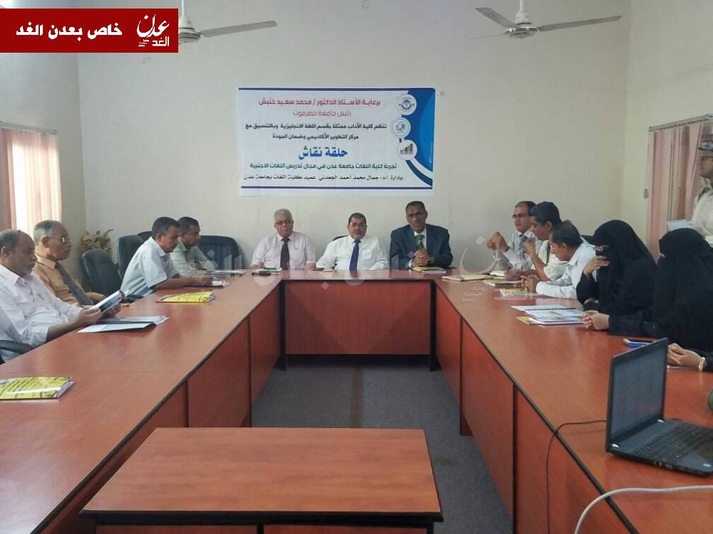 نظمت جامعة حضرموت ورشة علمية قام بادارتها البروفسور .د . جمال محمد الجعدني عميد كلية اللغات جامعة عدن ، وكانت بعنوان تجربة كلية اللغات جامعة عدن حيث قدم البروفسور الجعدني عرض مفصل متكامل وموزعا ورقيا على جميع المشاركين عن نشأة وتطور كلية اللغات وتركيزها على سياسة الاعتماد الذاتي في مختلف انشطتها وقال بأن كلية اللغات حديثة النشأة الا انها ركزت على فتح برامج دراسية ملبية لمتطلبات سوق العمل المحلية ، الخليجة والدولية ورافق ذلك عقد ورش علمية لتطوير مهارات اعضاء الهئية التدريسية ومراجعة وتحديث الخطط الدراسية ومفردات المساقات بين الحين والاخر لمواكبة كل التطورات العلمية، وكذلك انشاء مجلة دولية محكمةتعني بدراسات اللغة الإنجليزية والترجمة وحاصلة على الرقم الدولي للاصدار الالكتروني والورقي ، وتعتبر الاولى من نوعها في اليمن والجزيرة ، وقامت الكلية ببناء قاعات دراسية من مواردها المتواضعة وجهزت بأحدث التقنيات المتوفرة في ارقى جامعات العالم .